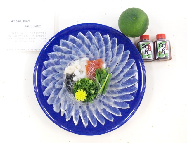 城下カレイは大分県日出城跡下の海底から湧き出る清水で育つマコガレイで、 「天下の美味」として知られる高級魚です。 さっぱり上品な味の中に独特の甘味があるお刺身です。